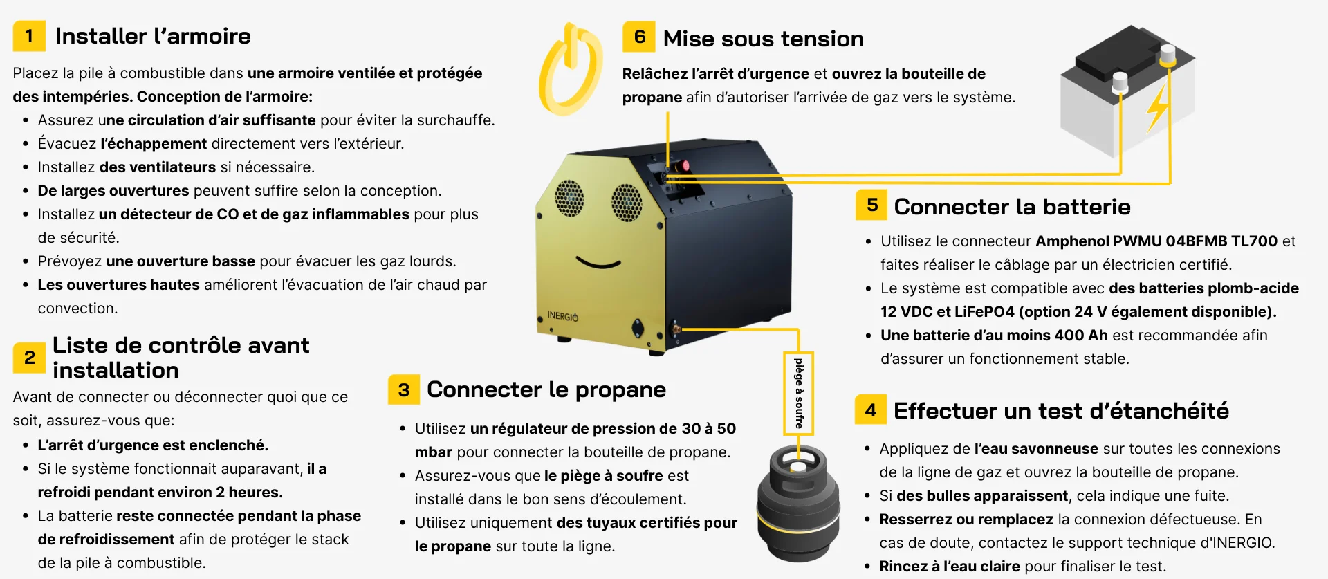 L’installation est conçue pour être aussi simple que celle d’un générateur diesel. Le système est prêt à l’emploi, ne nécessite aucune infrastructure spécifique et peut être opérationnel en quelques minutes. Il suffit de le connecter, de l’allumer et le système est prêt à fonctionner.